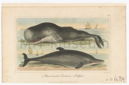 Blunt headed cachalot and Dolphin Colored engravings of a beached whale (top, labeled "1") and a beached …