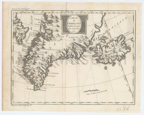 Carte du Groenland, Dress̩e et Grav̩e par Laurent Black and white engraved map, showing Greenland, Iceland and a port of …
