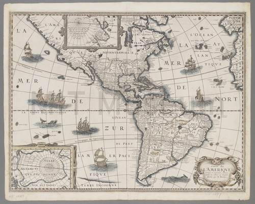 Carte de l'Amerique : corrige̩, et augmente̩, dessus toutes les aultres cy … Hand-colored map of North and South Americas with two inset maps depicting …