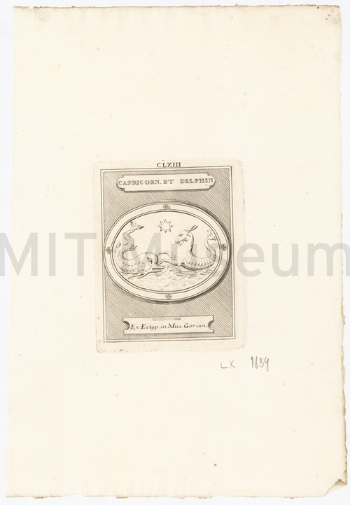 Capricorn et Delphin Uncolored engraving, labeled (plate) CLXIII, depicting a stone carved with a motif …