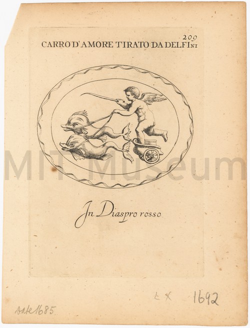 Carro d'Amore Tirato da Delfini Monochrome engraving titled "Carro d'Amore Tirato da Delfini" (English: Eros' cart drawn …
