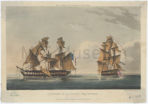 Capture of "La Didon", Augt. 10th. 1805. Hand-colored engraving of two vessels after a naval battle. At right, in …