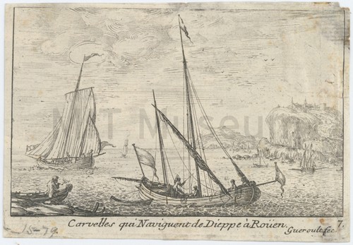 Carvelles qui Naviguent de Dieppe �� Ro�_en. Engraving depicting two caravels at sea, sailing towards the right, with coasts …