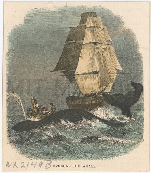 Capture of the whale Colored engraving showing a large whale partially submerged in the water with …