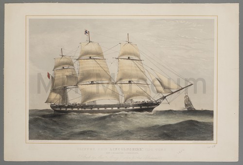 Clipper Ship "Lincolnshire," 1100 Tons Starboard-side view of the clipper ship 'Lincolnshire' at sea. She made regular …