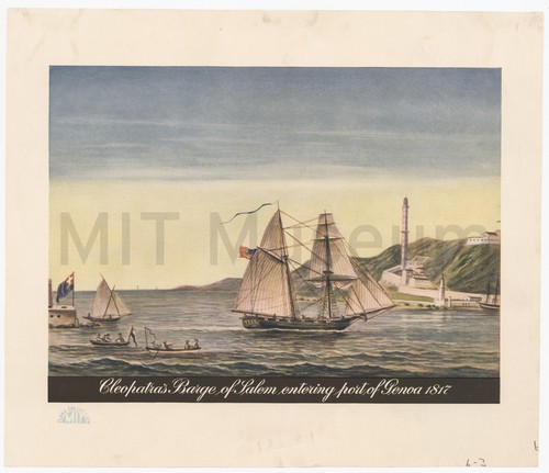 Cleopatra's Barge of Salem entering port of Genoa 1817 Side view ship portrait of a two-masted ship flying the American flag …