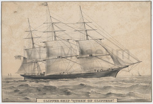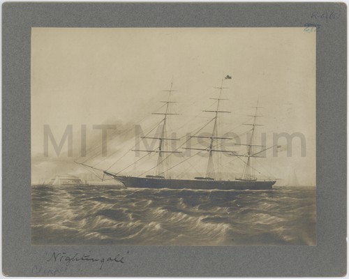 Clipper Nightingale Sepia photo-process print of a lithograph. Port-side view of clipper ship with …