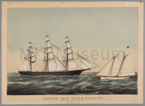 Clipper Ship "Ocean Express." Outward Bound, "Discharging the Pilot." Starboard-side view of the three-masted clipper ship as it is released by …