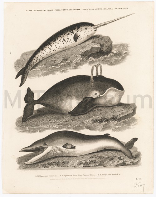 Class Mammalia, Order Cete, Genus Monodon, Narwhal. Genus Balaena, Mysticetus. Monochrome engraving featuring three beached whales. Top, a spotted narwhal, facing right. …
