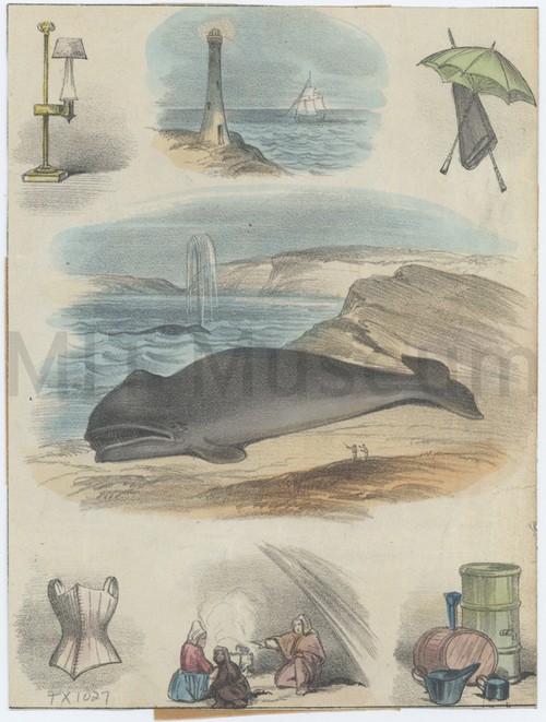 Colored pictures from an Atlas or Geography, showing the uses made of … Colored lithograph with a beached whale and several figures commenting on it …