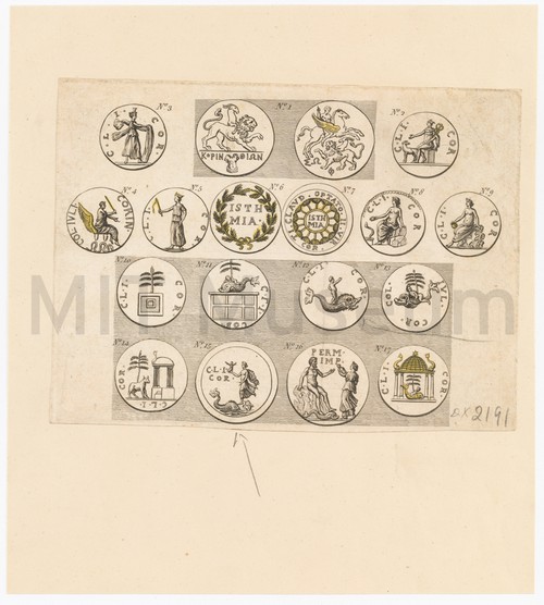Coins showing Arion on whale. Number 12 also Galatea on whale Monochrome engraving showing seventeen antique coins, probably both Greek and Roman in …