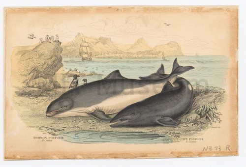 Common Porpoise - Cape Porpoise Colored engraving of a Common Porpoise and Cape Porpoise beached ashore.