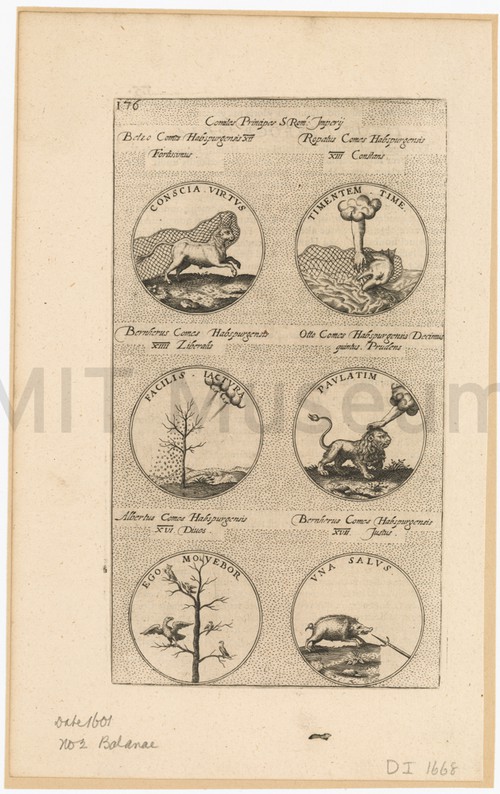 Comites Principes S Rom: Imperij Uncolored engraving depicting six medals or seals, with caption text in Latin. …