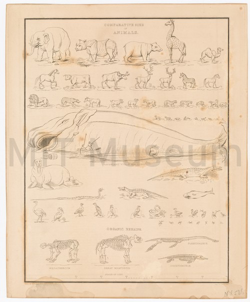 Comparative Size of Animals. Colored woodcut showing different animals to scale, with title printed below, "Comparative …