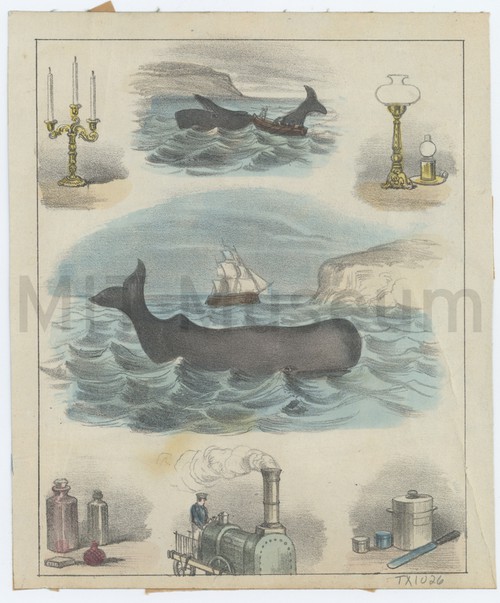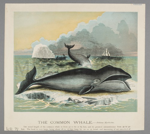 Colored pictures from an Atlas or Geography, showing by pictures the uses … Colored lithograph showing a large whale at sea, with white cliffs and …