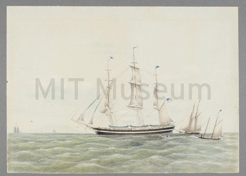 Close Company - A Whaler and Two Schooners Unsigned watercolor depicting the port-broadside view of an unidentified whaleship with two …
