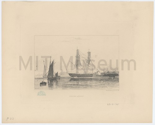 Collier & c. (Calm). View of a collier (at center), several small sailboats, and a steamship …