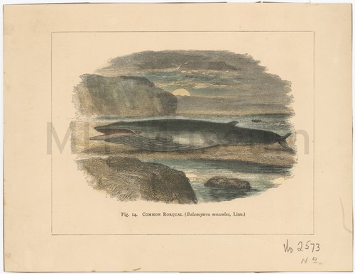 Common Rorqual (Balaenoptera Musculus, Linn.) Fig. 14 Hand-colored engraving depicting a beached rorqual with a small boat and a …