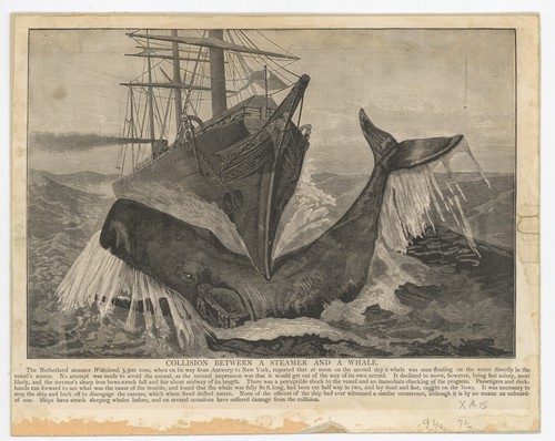 Collision between a Steamer and a Whale Frontview depiction of the Netherland steamer Waesland, bound to New York from …