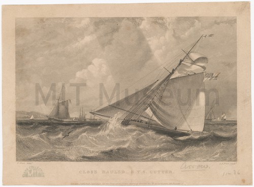 Close Hauled -- R.Y.S. Cutter Side view ship portrait of a cutter tilting on a choppy sea, …