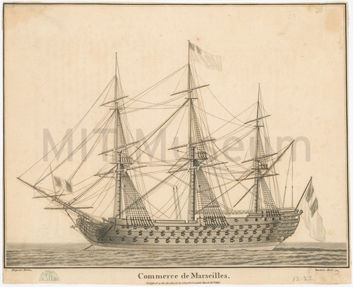 Commerce de Marseilles Uncolored engraving depicting a side view of a gunship with three masts …