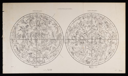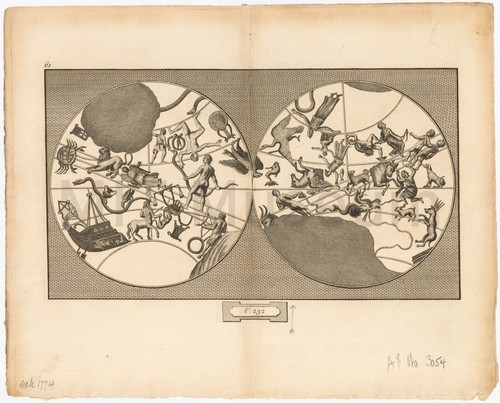Constellations(V. 232) Monochrome engraving with two celestial hemispheres showing the figures of the constellations, …