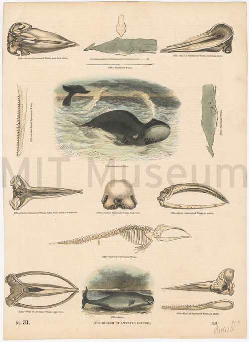 (The Museum of Animated Nature) No. 31 Hand-colored natural history illustration showing various whales as well as details of …