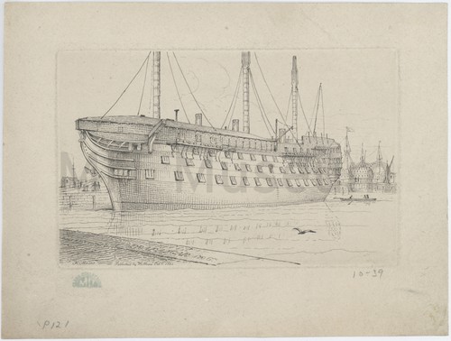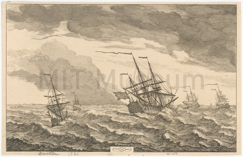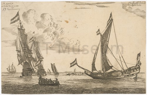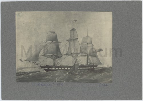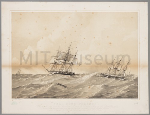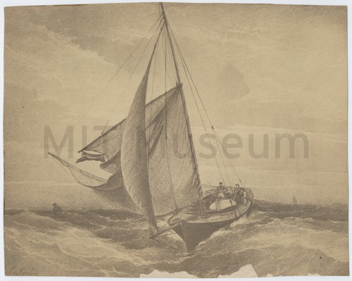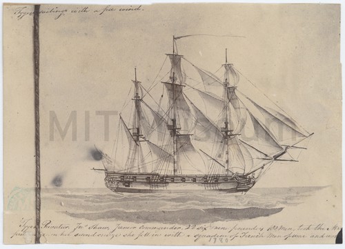 "Tyger" sailing with a free wind. Photograph of a watercolor, showing a privateer in side view. She flies …