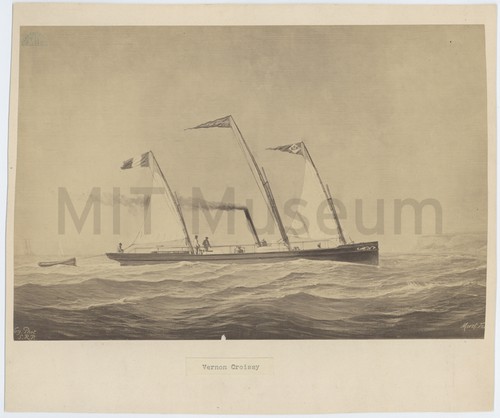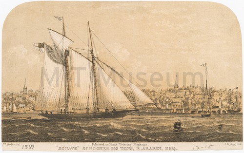 "Zouave" Schooner 105 Tons, R. Arabin, Esq. Tinted lithograph depicting a side view of a yacht with a portside …