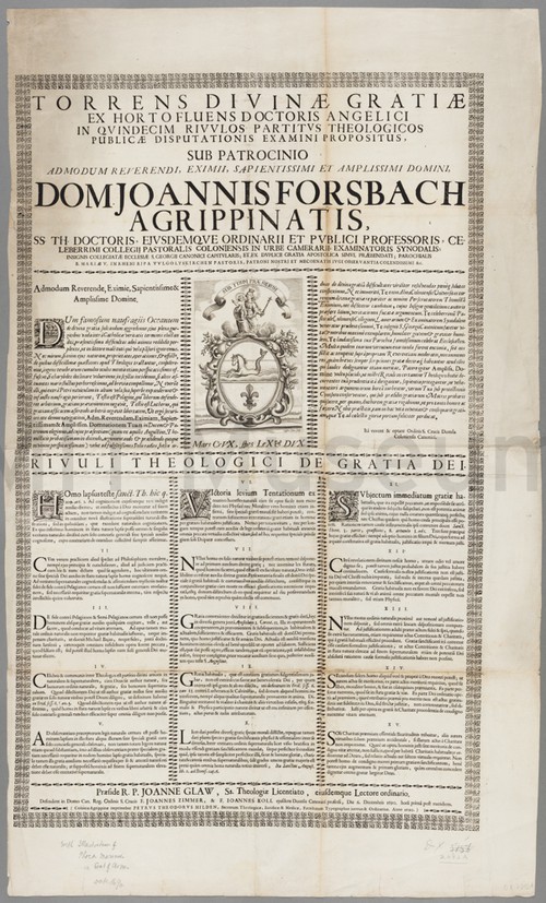 "Torrens Divinae Gratiae" etc. Phoca Marinus in Coat of Arms A broadside that announces a public examination in theology sponsored by Dom …
