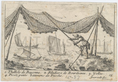 1. Thillole de Bayonne 2. Filadiere de Bourdeaux. 3. Yolles. 4. Picot, … Engraving depicting four fishing vessels, as seen from the coast with a …