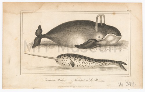 1. The Common Whale 2. Narwhal or Sea Unicorn plate 72 Black and white image depicting a side view of common whale, which …