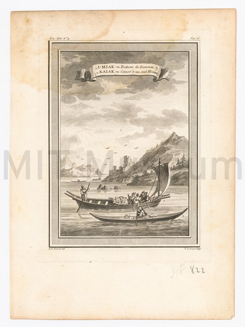 1. Umiak ou Bateau de Femmes et 2. Kaiak ou Canot a … Black and white engraving of (1) an Umiak, or boat for females …