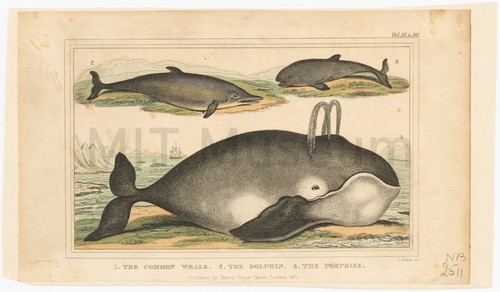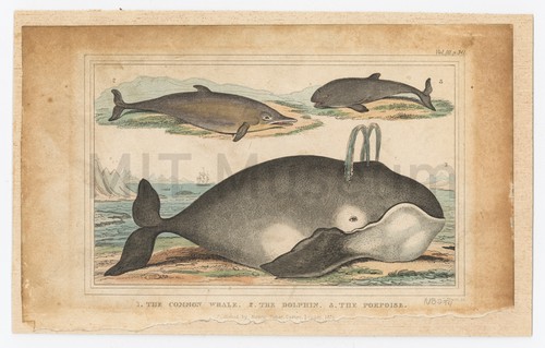 1. The Common Whale, 2. The Dolphin, 3. The Porpoise Colored engraving depicting three scenes of beached cetaceans. At top, on left …