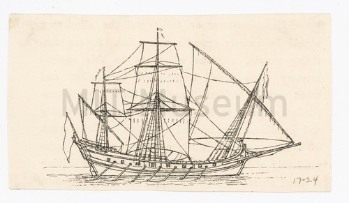 16th Century French Ship Halftone of an engraving that depicts a French and sixteenth-century Man of …