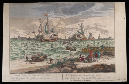 'T Binnen Seylen Der Groenland Vaarders. Med: Fol. no. 3 Hand-colored engraving depicting a shore with ships at sea in the background. …