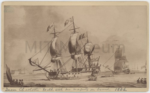 "Queen Charlotte" yacht with Her Majesty on board. 1806. Side view of the yacht "Queen Charlotte" at sea with a coastline …