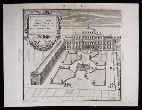Cortile Avanti il Palazzo Con La Fontana Della Caccia Del Cervo Nel … Uncolored engraving with a bird's eye view of a palace courtyard, featuring …