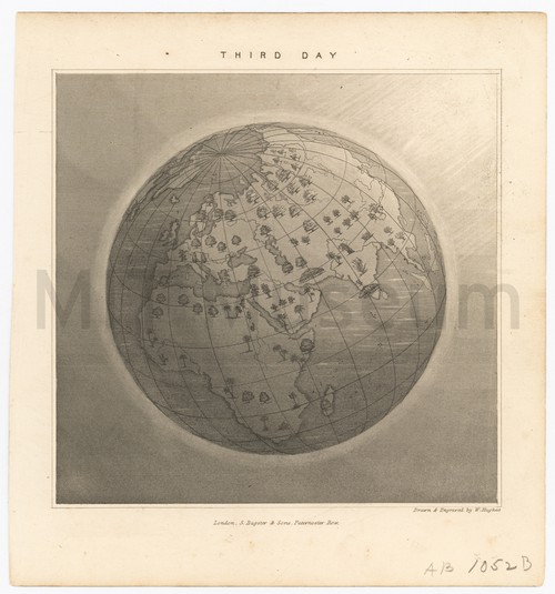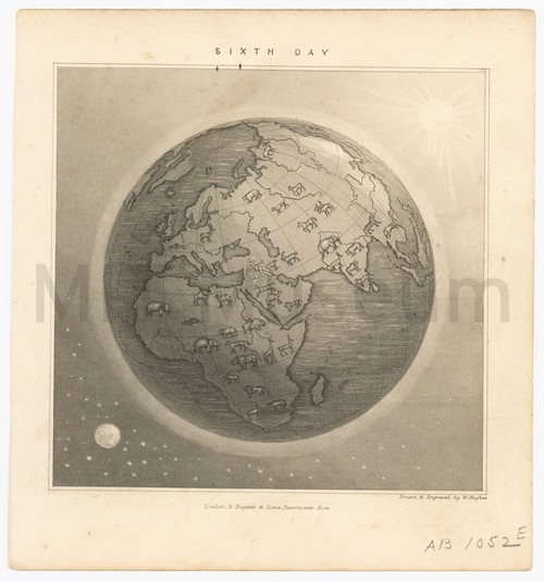 Creation of Earth: Sixth Day Monochrome engraving showing the terrestrial globe, with the sun at top right …