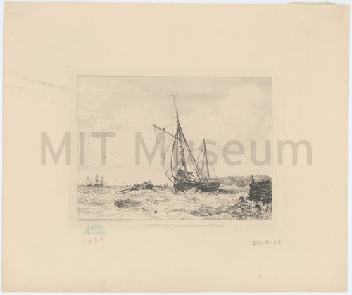 Cowes Boat etc. coming out of the harbour. Depiction of a two-masted vessel sailing out to sea--towards the viewer--with a …