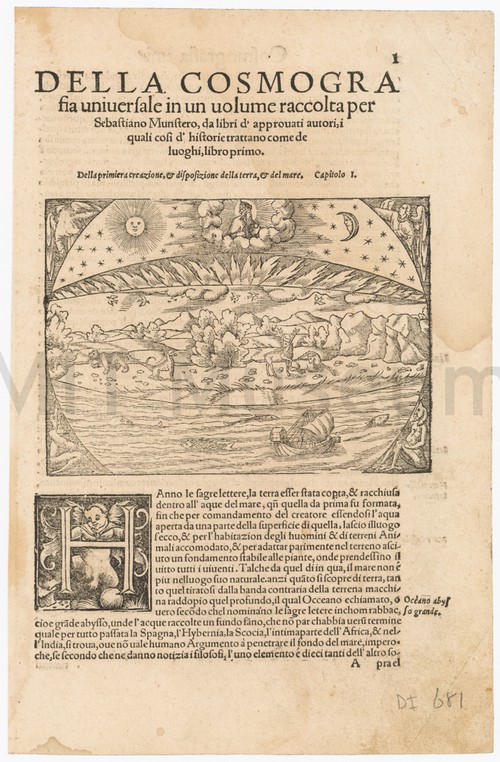 Cosmographia Universale Page from the book "Cosmographia Universale" with woodcut showing a ship sailing …