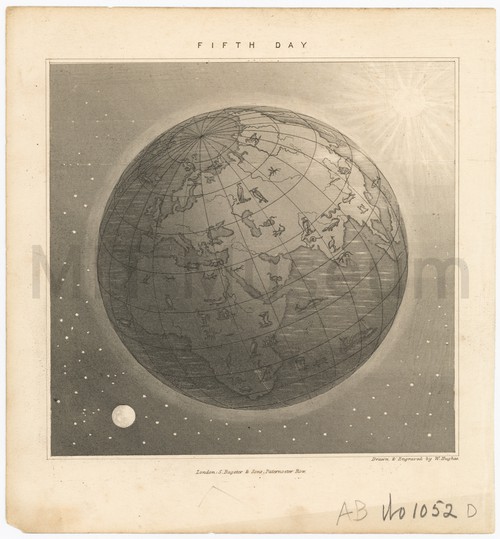 Creation of Earth: Fifth Day Monochrome engraving showing the terrestrial globe, with the sun at top right …