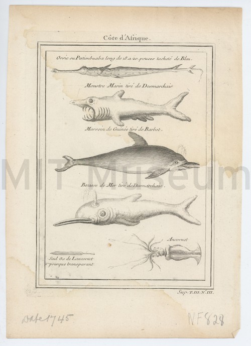 Cote d'Afrique (Showing four species of whales) Engraving of sharks, porpoises, and squid from the coast of Africa. Published …