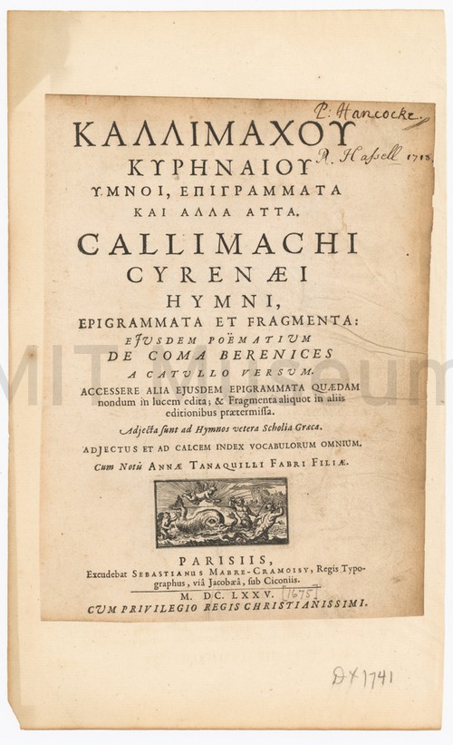 Cover page, showing cut of whale Title page from a book, with title given first in Greek, then …