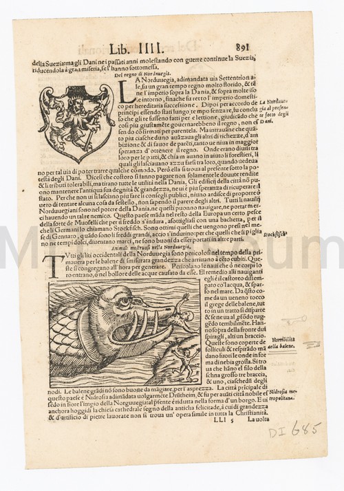 Cosmographia Universale: Horribilita della Balene Page from the book "Cosmographia Universale" with a description of "Animali mostruosi …
