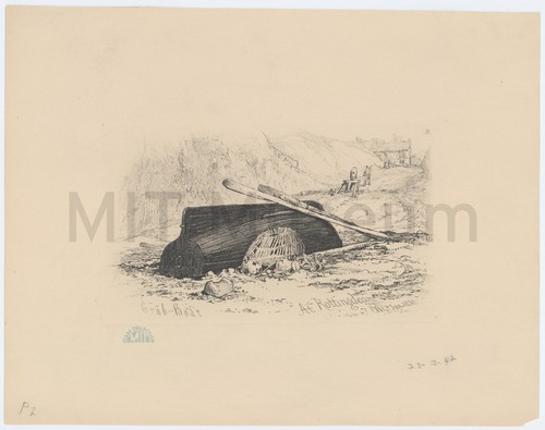 Crab-boat at Rottingdean View of a small upturned boat, with a lobster-trap and a pair …