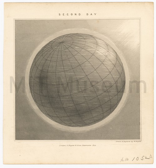 Creation of Earth: Second Day Monochrome engraving showing the bare terrestrial globe, lit from one side and …