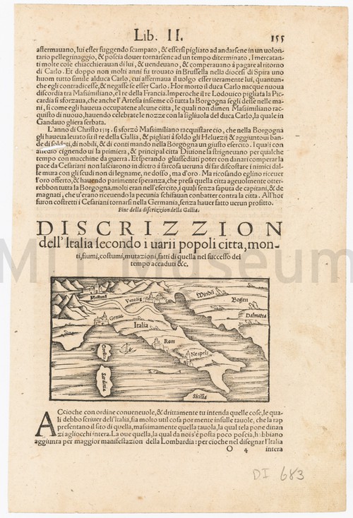 Cosmographia Universale: Discrizzion dell' Italia Page from the book "Cosmographia Universale" with a map of Italy showing …