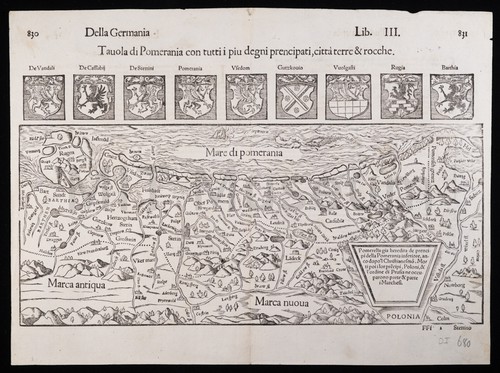 Della Germania. Tavola di Pomerania con tutti i piu degni prencipati, citta … Woodcut map of Germany, with the Pomeranian Sea at top, and cities, …