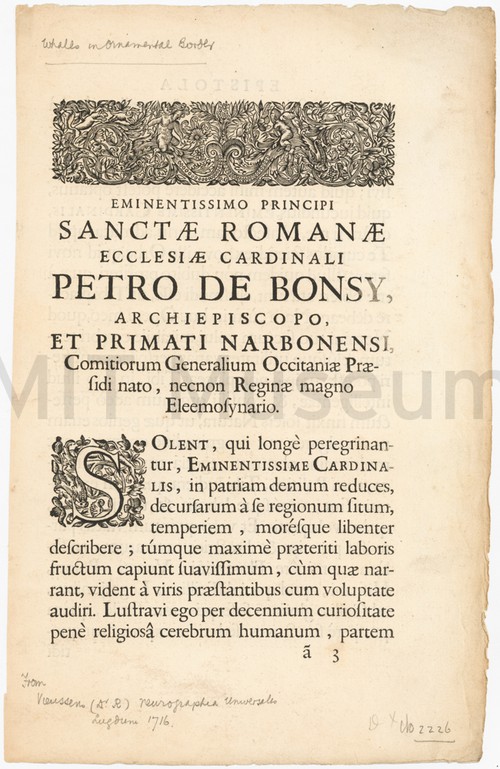 Dedicatory page of "Neurographia Universalis" Dedicatory page from the book "Neurographia Universalis" (1716 ed.), dedicating the text …